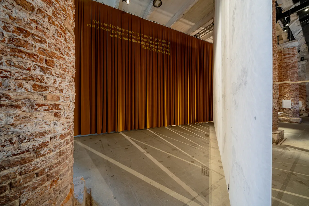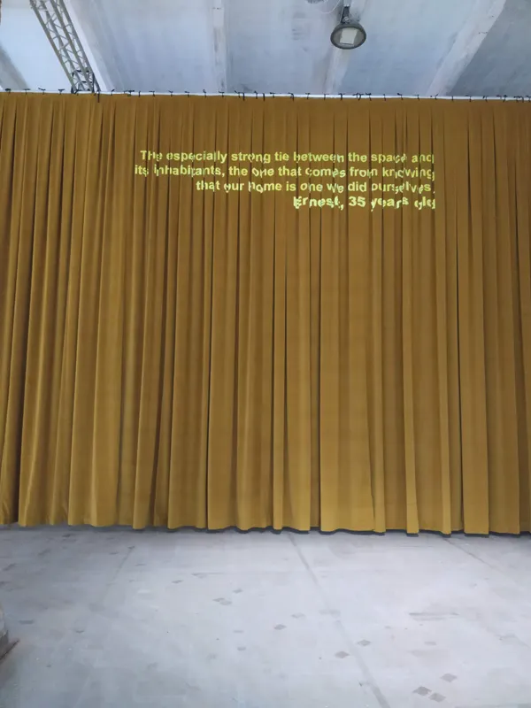 The installation space is defined by a single element: a large curtain near one of the existing pavilion walls. This gesture creates two spaces(one interior and one exterior) through which visitors must pass.